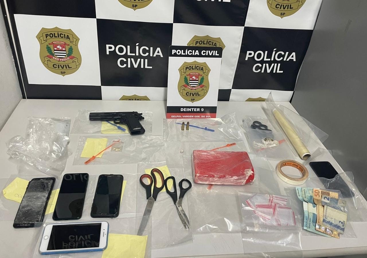 Os policiais também apreenderam objetos utilizados para fracionar, pesar e embalar drogas, cinco aparelhos celulares, um soco inglês, um pino de cocaína, quatro pedras de crack, quatro porções de cocaína já embaladas para a venda, um tablete de cocaína de pouco mais de 1 kg, além de um simulacro, duas munições calibre 38 e R$ 252.