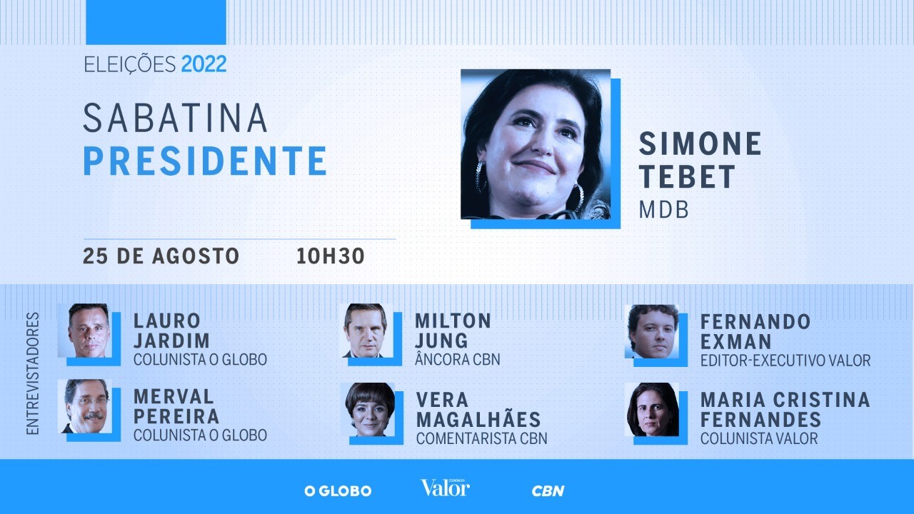 Tebet participa, nesta quinta-feira, da série de sabatinas do Valor, “O Globo” e “CBN” com presidenciáveis. A entrevista começa às 10h30 e terá duração de uma hora e meia. Você pode acompanhar ao vivo pela rádio e nos sites e redes sociais dos veículos.
